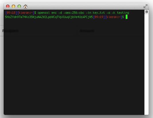 We use the Gibberish AES Javascript library to generate our AES encryption. To get this to work on the command you need to cut and paste the private key data into a text file and preserve the line breaks.